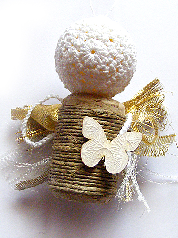 Jakiś czas temu natknęłam się w necie na aniołki wykonane na bazie korków po winie .... i co? I pokochałam je miłością tak wielką, że sama postanowiłam zrobić sobie swoje. Miały być delikatne i jak najbardziej bliskie naturze, czyli utrzymane w kolorystyce: bieli, beżu, złota i brązu sznurka pakowego. Bardzo mi zależało by było widać, z czego są zrobione. Bazę - korpus - wykonałam właśnie z korków. Na moich dodatkowo był napis LOVE, który też wykorzystałam. Głowa to szydełkowa kulka ... skrzydełka ozdobne wstążki, od których uginają się półki w sklepie Rapakivi. Ja mam sentyment zwłaszcza do tych w kropki.